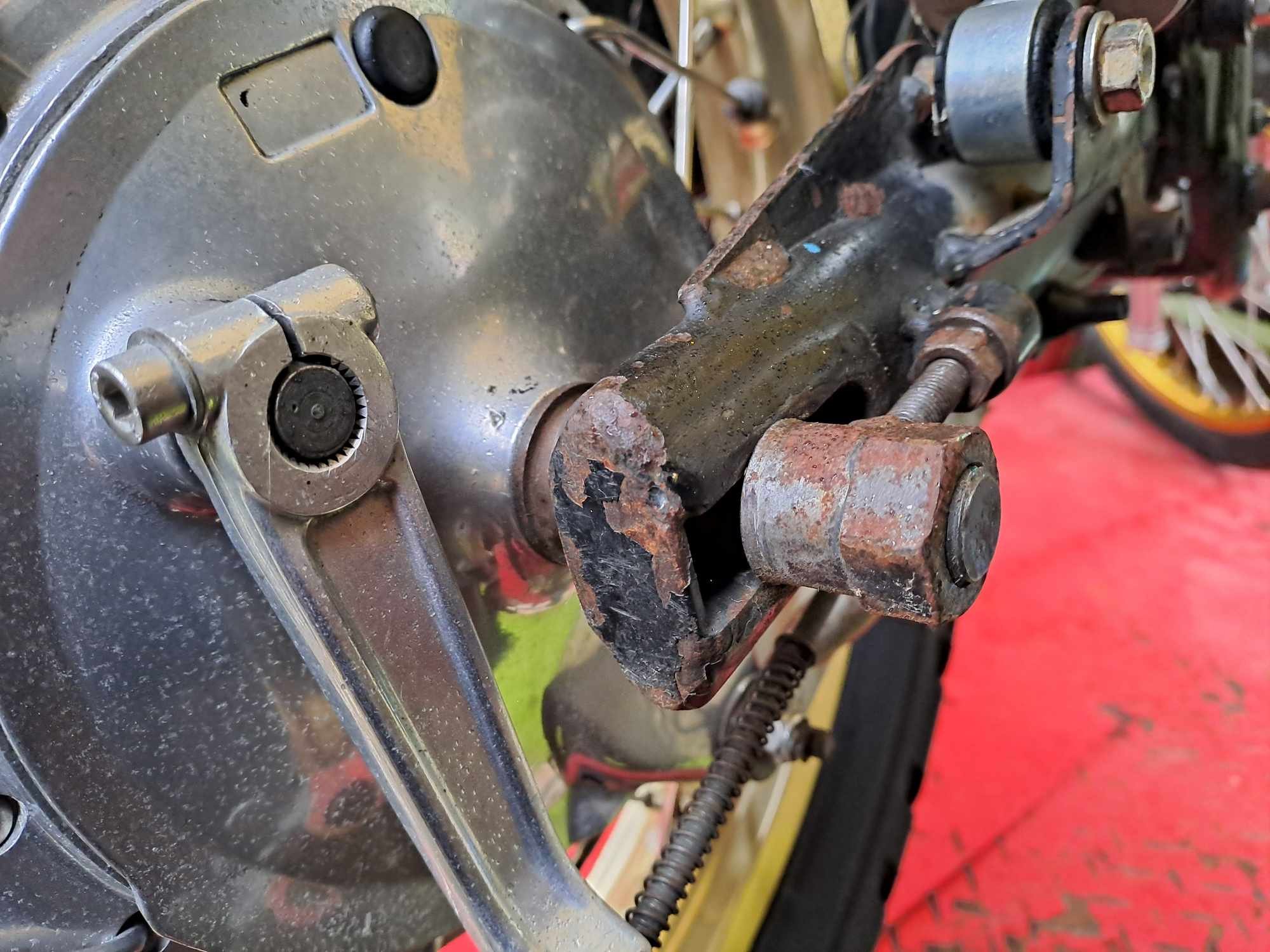 Die Schrauben musste ich auch ersetzen, aber die Gewindegänge sind in Ordnung. Das Bremsgestänge ist hier noch in kurzer Version von der originalen Schwinge, da das längere nicht mehr dabei war.