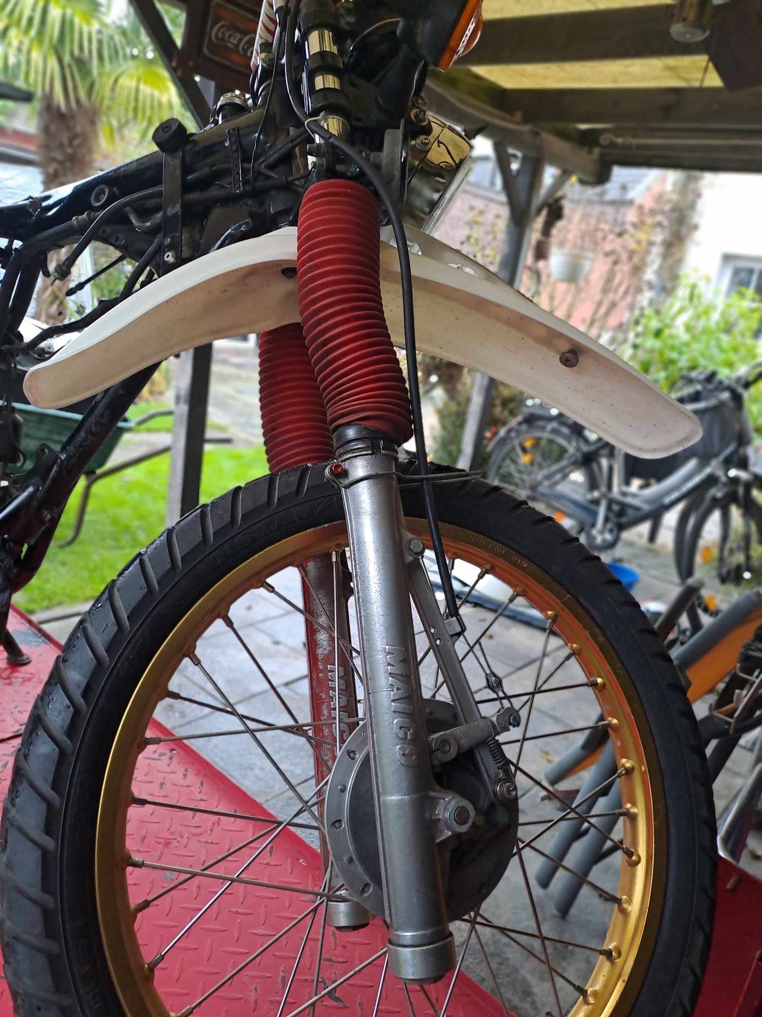 Des weiteren sind 38er Gabelohre von Maico mit Gasdruck Ventilen verbaut (Maico 400?).