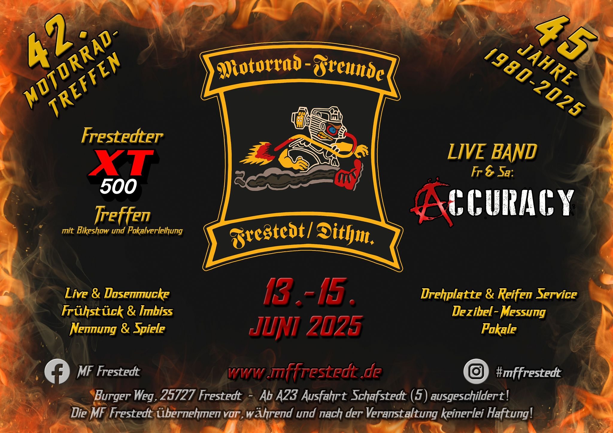 Mein Name ist Theo von den Motorrad -Freunden Frestedt. Wir veranstalten schon sein 42 Jahren eines der größten Motorradtreffen in Norddeutschland. Dieses Jahr gibt es ganz was Besonderes. Da zwei von meinen Clubkameraden und ich eine XT 500 fahren, wollen wir dieses Jahr zusätzlich ein XT 500 Treffen organisieren. Hierzu wollen wir euch herzlich einladen. Für alle Fahrer die mit der XT anreisen gibt es freien Eintritt / ein Freigetränk und einen separaten Zeltplatz. Außerdem gibt es Pokale für die schönste XT und für die weiteste Anreise mit der XT.