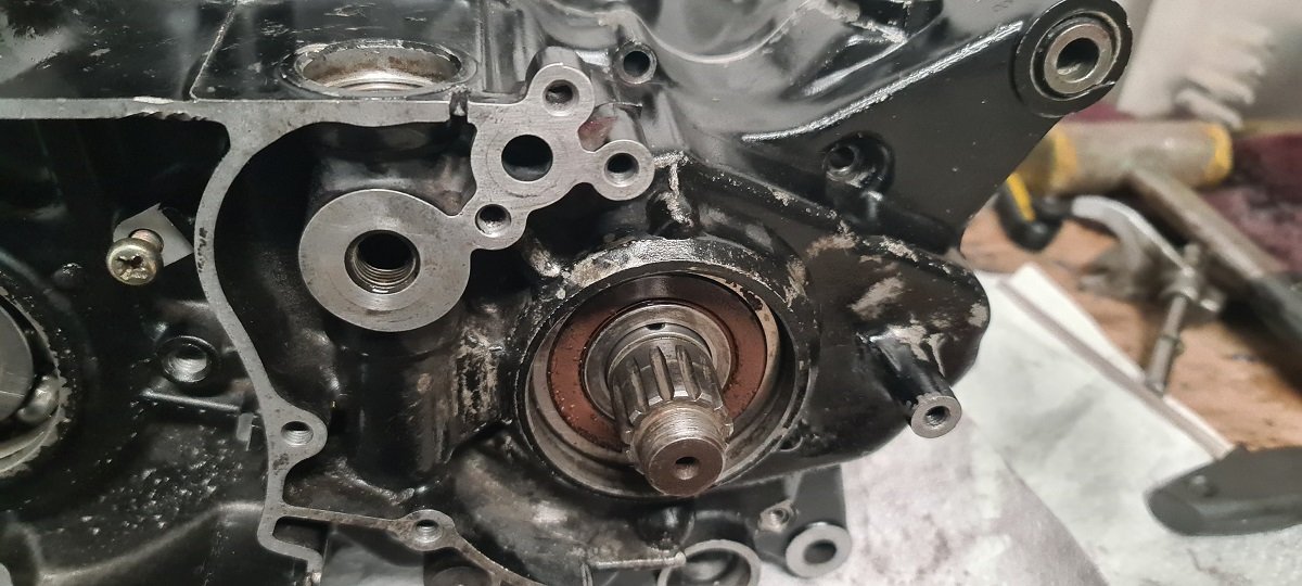 Für den Erststart habe ich den Seitendeckel abgenommen. Ich hatte vor mir die Verschleissteile einschliesslich Kupplung anzuschauen. Dabei ist mir aufgefallen das das die Steuerkettenschraube lose war und einen Abdruck im Kupplungsdeckel hinterlassen hat.. Zu meinem Erschrecken war das Gewinde völlig ruiniert. Da dies nicht wirklich reparabel ist habe ich angefangen die Maschine wieder zu zerlegen.