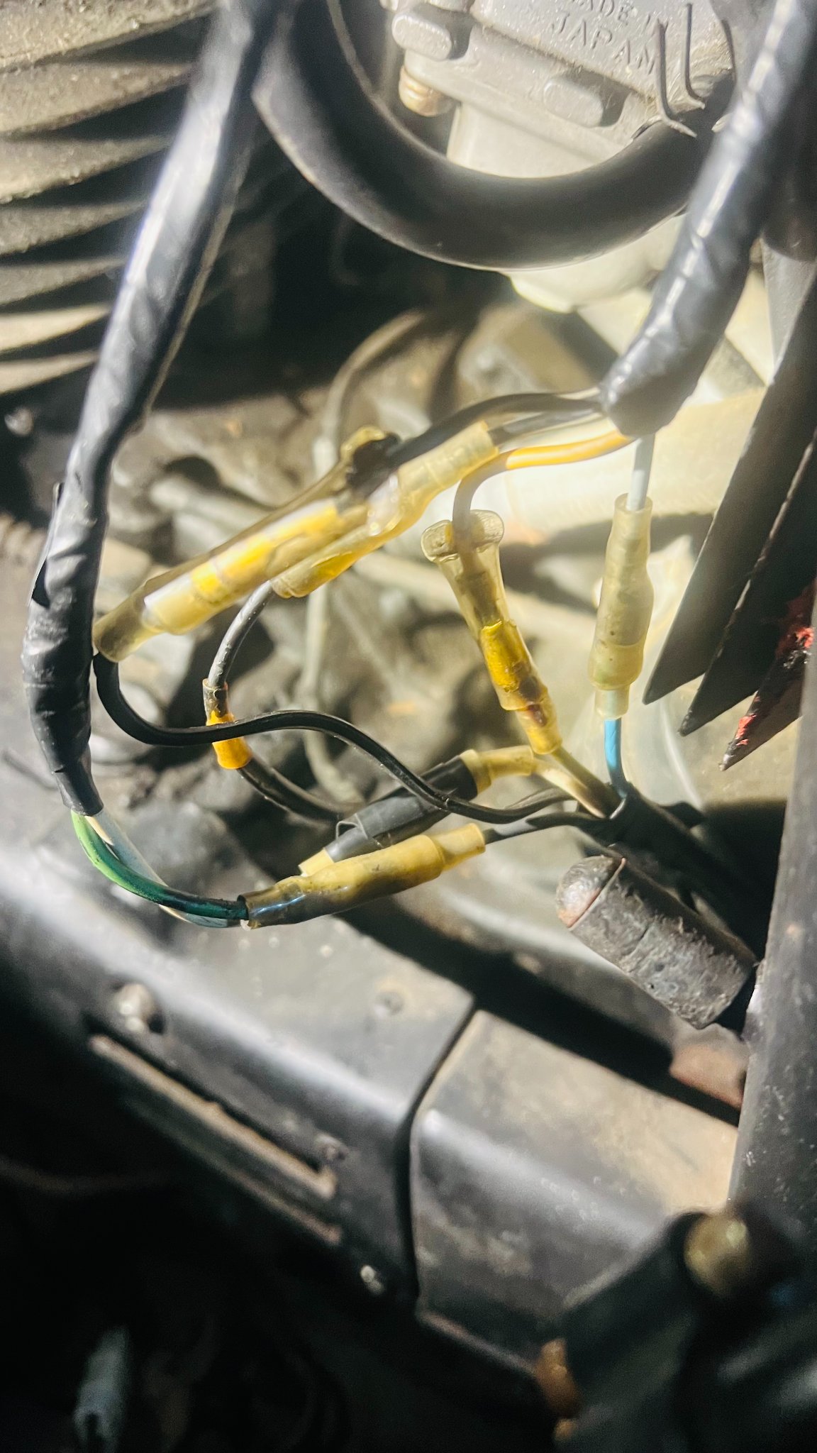 ...da würde mal gebastelt. Der vierfache Blockstecker würde gegen einzelne "Japanstecker" getauscht. Normalerweise kommen schwarzweiß, gelb und weiß aus der Lima und zusätzlich das Hellblaue vom LL-Schalter an diesen Stecker. Wie von Hans geschrieben, bringt das SW die Primärspannung an Zündspule und Unterbrecher.
