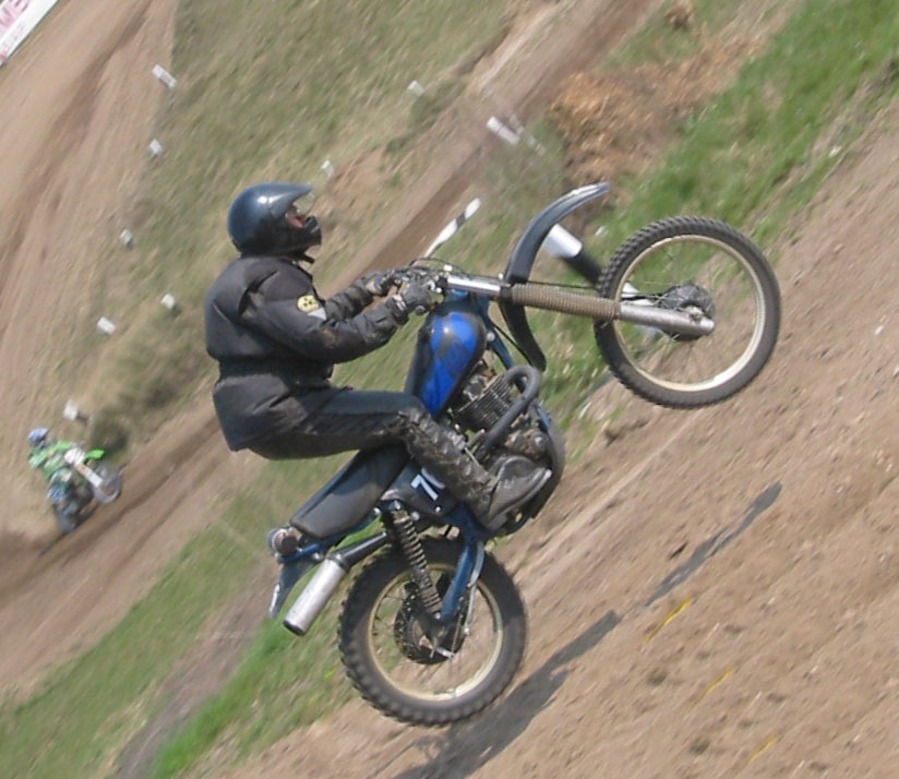 der macht doch alles richtig, zylinder parallel zur fahrbahn und die augen richtung kurvenausgang, dabei den hahn voll auf (man beachte die dreckfontäne am hinterrad...)