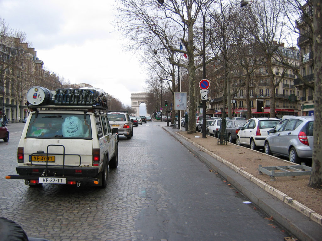 Um 11.30 Uhr macht Auriol, nach einem Fototermin mit allen XTs in Reihe, Fahrerbesprechung von einer Ladefläche aus. Er heißt uns willkommen und freut sich, dass wir alle zu diesem Event gekommen sind. Nach kurzen Instruktionen zum Konvoi Richtung Eiffelturm, geht es um 12.00 Uhr los. Die XTs, und damit Marco, fahren vorweg und die 4x4s hinterher. Eskortiert wird das ganze von drei Polizei-YAMAHAs, die gnadenlos die Straßen sperren. Trotzdem verpasst ein holländischer 4x4 den Anschluß und alle anderen folgen ihm. Lutz und ich im Landy sind auch dabei, aber die Indianer (Team 22) setzen sich nach vorne und führen uns sicher zum Arc de Triomphe und zum Eiffelturm. Es regnet, aber wir sind so aufgeregt, dass es uns nicht stört.