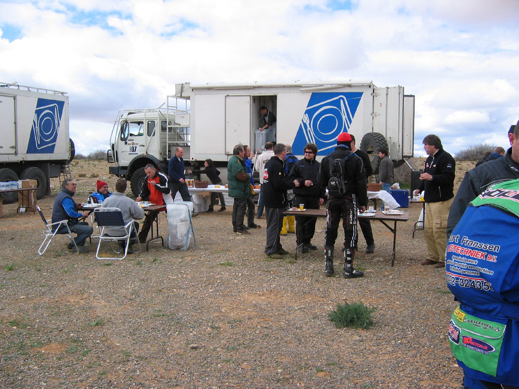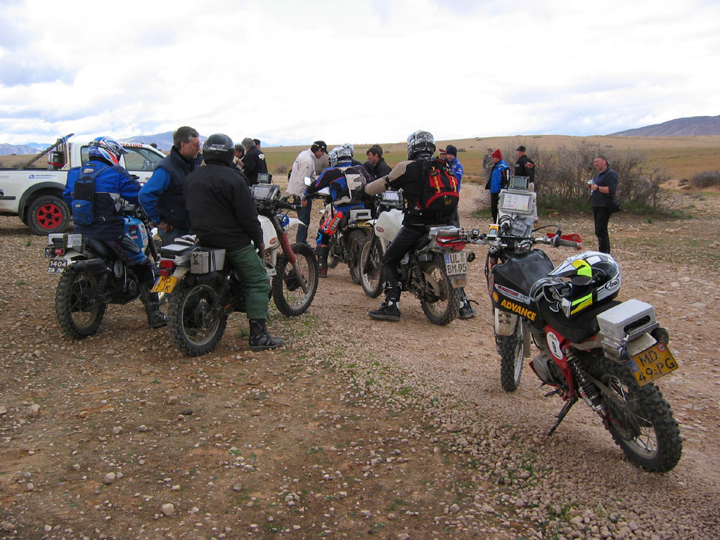 Schon nach wenigen hundert Metern verzweigt der Weg so, wie es nicht im Roadbook steht. Ein Blick zurück zum Besenwagen zeigt, dass ich zufällig den richtigen gewählt habe. Doch schon wenige Meter weiter wieder drei Wege in verschiedene Richtungen. Ist der IMO doof oder das Roadbook, oder bin ich es? Ich blicke auf den GPS, in dem ca. 10 Wegepunkte der SS04 gespeichert sind und entscheide mich für links. Auch im weiteren Verlauf der Strecke immer wieder ungereimtheiten in dem Roadbook. Nach ca. 5km kommen mir schon ca. 8 XTs mit Holländern entgegen. Unbeirrt fahre ich weiter, zeigt der GPS doch in die richtige Richtung. Nach der ersten Oued-Durchquerung treffe ich auf Peter van den Bosch (Team 15), dem die gesamte Roadbook-GPS-IMO-Halterung abgebrochen ist. Ich helfe mit Leatherman, zwei Muttern und Kabelbinder das Ganze komplett abzunehmen, am Rucksack zu befestigen und den Lenker festzuschrauben. Inzwischen sind etwa 10 XTs in der Gegend und ein ORG 4x4. Ich entschließe mich alleine weiter zu fahren und erreiche nach weiteren 5km die Straße, einen sicheren Punkt im Roadbook. Die restlichen 38km verlaufen ähnlich. Das Roadbook ist zu ungenau, bzw. zu viele Wege zweigen vom Hauptweg ab und der GPS hilft bei der Wahl des Weges. Hilfen aus dem Roadbook, wie Brunnen oder Friedhof, finde ich nicht, und trotzdem scheint der richtige Weg gewählt, denn plötzlich komme ich wieder an eine Teerstraße, wo Auriol wartet. Das Ende der SS04 ist schon erreicht. Unglaublich. Als letzter gestartet, bestimmt 12 XTs in Orientierungslosigkeit überholt und nur 50min gebraucht. Wie ärgerlich, gibt natürlich trotzdem 20 Strafpunkte, denn 70min waren vorgegeben. Na ja, immerhin 8ter Platz, wie wir am Abend erfahren. Damit in der Gesamtwertung auf Platz 15.