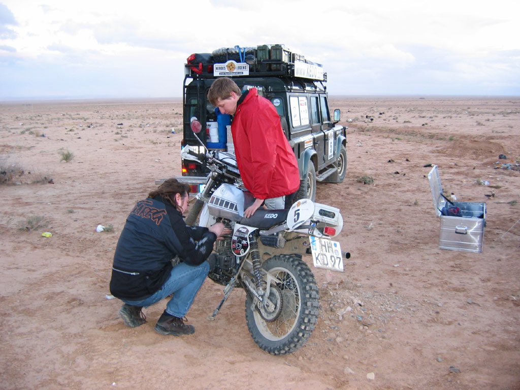 Gegen 7.00 Uhr bekommen wir die Pässe und Kfz-Papiere. Ich bin froh, dass alles mit der Landyversicherung akzeptiert wurde. Wenig später dürfen wir zu den Autos und das Schiff legt an. Beim Verlassen der Fähre wird noch kurz der Stempel im Paß überprüft und schon finden wir uns in der Halle für die Kfz-Einfuhr wieder. Hier haben wir genug Zeit die XT abzuladen. Zwischendurch kommen immer wieder Polizisten und Zollbeamte, die Papiere sehen möchten, kontrollieren oder stempeln. Wir packen die Werkzeugtasche für die XT und den Rucksack für den XT-Fahrer. Wir hätten früher probieren sollen, ob die XT überhaupt anspringt, denn sie tut es nicht und wir sind schon die Vorletzten. Alle Versuche der XT ein anbruppen zu entlocken scheitern, und so laden wir sie letztendlich wieder auf und fahren los. Glücklicherweise stehen auf den folgenden km weitere Team am Straßenrand, so dass wir Zeit vor dem Besenwagen gewinnen und nach 17km auf einer Tanke im aufgeladenen Zustand noch einmal unser Glück versuchen. Siehe da, die XT springt an. Abladen, ich ziehe mich an und los. Ohne weitere Probleme erreichen wir nach ca. 90 km den Start der SS4 und damit das Frühstück. Allerdings ist mir beim Foto schießen unterwegs die XT wieder ausgegangen und nur durch Bergabrollen wieder an. Lutz versucht zu kicken, aber sie springt nicht wieder an. Wir entscheiden uns für den Vergasertausch. Tatsächlich springt die XT an, doch eine Probefahrt ergibt ein stotterndes, ausgehendes und vor allem nicht wieder anspringendes Ergebnis. Wir tauschen die Lima. Danach tauschen wir die Kontaktplatte mit Kondensator und auch noch die Zündspule. Irgendwie ist der Zündfunke sehr schwach bis gar nicht vorhanden. Also vermuten wir einen Fehler im Killschalter und ziehen ihn in der Lampe ab. Zündfunke ist gut, aber die XT läuft immer noch total schlecht. Währendessen startet eine XT nach der anderen zur SS4. Der Starter macht uns darauf aufmerksam, dass wir 2 min nach der letzten XT auch starten müssen. Auriol sagt uns, dass wir sie sonst halt aufladen müssen. Es sind noch 4 XTs vor uns, als wir beschließen den Vergaser zurück zu tauschen. Wir schaffen es in 4 min. Nach 5 Kicks springt die XT an und wir machen keine Probefahrt mehr. Ich ziehe mich an uns stehe just in Time am Start.
