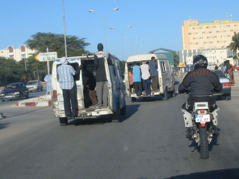 Nach 90km sind Lutz im Landy und ich auf der XT in Nouakchott. Auf einer der ersten Stationen tanken wir Diesel. Der offizielle Kurs ist etwa 330 Oudingsda, der Tankwart bietet mir 230 an, wir einigen uns auf 250, was genau dem Diesel-Literpreis entspricht. Benzin gibt es bei dieser Tanke, wie auch auf vielen anderen nicht. Das Hotel Houda soll immer gerade aus sein. Wir fahren weiter und versuchen hier und da Benzin für die XT zu bekommen und nach dem Weg zu fragen. Doch entweder nimmt man keine Euro, oder es gibt kein Benzin, und ich habe den Eindruck, dass die nur so tun, als ob sie wüssten, wo das Hotel Houda ist. Der Verkehr ist unglaublich, hunderte von Eselskarren, die jeweils zwei Zweihundertliterfässer transportieren, um Wasser zu holen. Dann überall Sammeltaxen, alte 207 MB Transporter. Eigentlich müssen wir geradeaus, doch die Straße nach rechts sieht mehr nach Zentrum aus. Wir biegen ab und haben auf einer Tanke glück, das Hotel ist nur wenige hundert Meter entfernt. An der Reception frage ich nach Marco in Zimmer 415. Er ist in Zimmer 110 und man bringt mich hin. Marco liegt auf dem Bett, ist aber abholbereit. Er hat fünf Röntgenbilder bei sich. Bezahlen müssen wir nichts. Also wieder in den Verkehr und aus Nouakchott raus. Wir finden sogar noch eine Tanke, auf der wir die XT und den Kanister voll tanken können.
