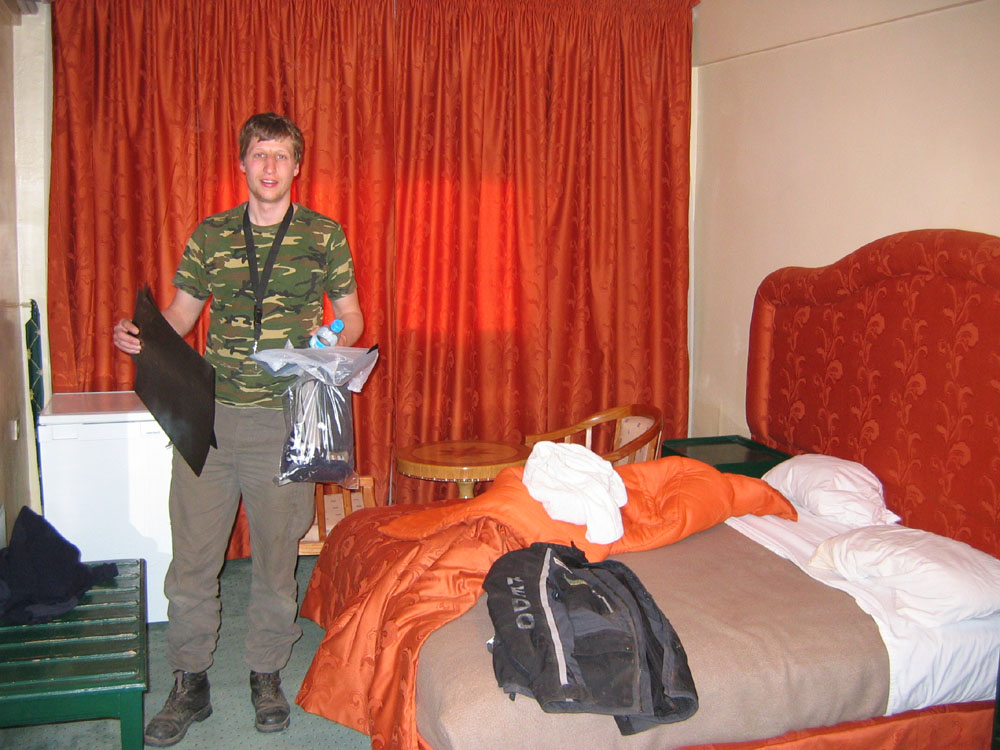 7.15 Uhr brechen Lutz und ich schon 15min vor der Startzeit auf, um Marco aus dem Hotel abzuholen. Der Arzt hatte uns nur den Namen Hotel Houda und die Zimmernummer 415 gegeben. Wo das Hotel ist, weiß er auch nicht, aber wir sollen uns durchfragen. Ein Taxi hatte Marco abgeholte und in das Krankenhaus gebracht. Dort hat er einen Dolmetscher bekommen und wurde geröntgt (???). Danacht hat der Krankenhausarzt mit dem HL Arzt telefoniert und alles in Ordnung gemeldet. Dass gar nicht alle Untersuchungen gemacht wurden, die der HL Arzt sich gewünscht hatte, wurde da wohl noch gar nicht klar. Auf jeden Fall scheint das Krankenhaus nicht genug Betten zu haben, oder aber keine, die für Europäer geeignet sind, also hat es ein Abkommen mit dem Hotel Houda, in das Marco dann gebracht wurde.