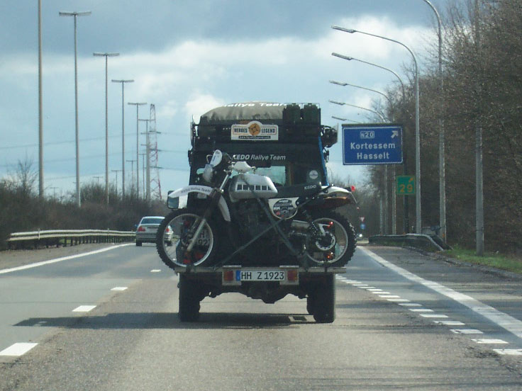 Da ich am Wochenende nach der Ankunft der Fahrzeuge ein LandRover-Treffen organisiert habe (wie doof ohne Landy) kann ich erst dieses Wochenende nach Belgien fahren. Björn ist so nett mich hin zu fahren. Wir treffen uns am Samstag Morgen um 09.00 Uhr und fahren die fast 600km nach Belgien zu Johny. Wir kommen gut durch und sind am frühen Nachmittag schon da. Und da steht der, der Landy, im Garten bei Johny. So wie es aussieht geht es ihm gut. Alles dran, alles drin. Und die KEDO-XT steht brav im Schuppen … und springt auf den ersten Kick an. Schön.