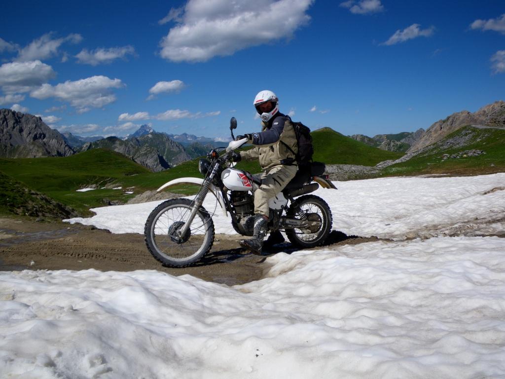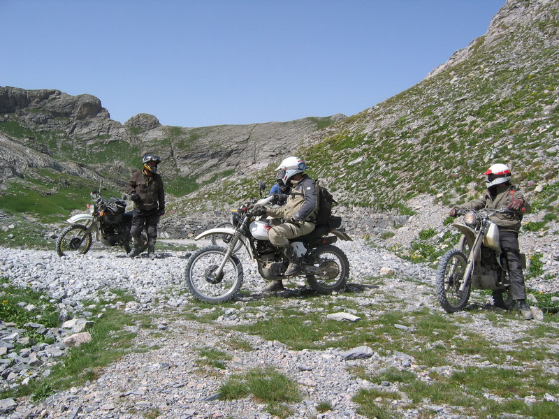 Nach dem Verzehr der Baguettes, die wir von nun an jeden Morgen auf dem Campingplatz bestellt hatten, brechen wir um 9.30 Uhr auf nach Tende. Für die etwa 40km benötigen wir eine ganze Stunde. Als Flachlandfischköppe müssen wir uns erst auf die andere Strecken-Zeitrechnung einstellen. Die Ösis begrüßen uns auf dem Campingplatz in Tende, der wie schon befürchtet für das Internationale XT500-Treffen zu klein ist. Gemeinsam brechen wir auf, um die Ligurische Grenzkammstraße von Norden her zu befahren. Der Col de Tende ist schon der Hammer. Die ersten 70% sind noch geteert, dann geht es weiter auf Schotter. Unglaublich viele Serpentinen winden sich den Berg auf 1871m hinauf. Oben wacht das Fort Central. Es ist erstaunlich gut erhalten. Während HorXT, der nix von Forts hält, auf die XT aufpasst, klettern wir über eine Schießscharte im Südwesten in das Fort und erkunden jeden Gang und jede Etage. Auch Herbert dauert das dann doch etwas zu lange und er gibt uns ein Zeichen zum Aufbruch.